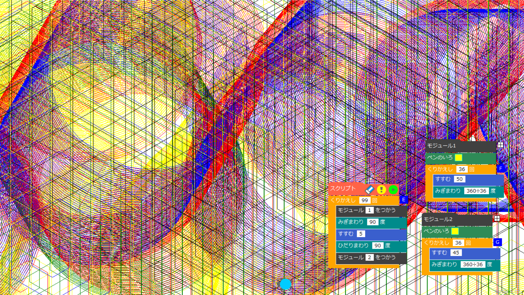 変数(へんすう)をつかって、いろいろな渦巻を描く仕組みをプログラミングしました。