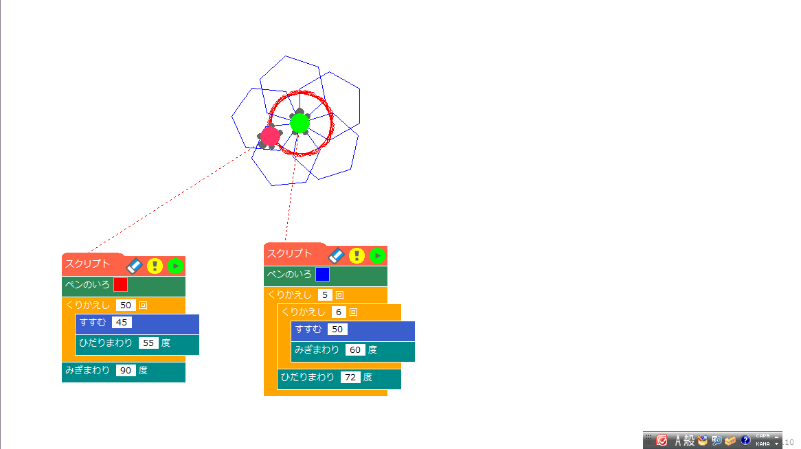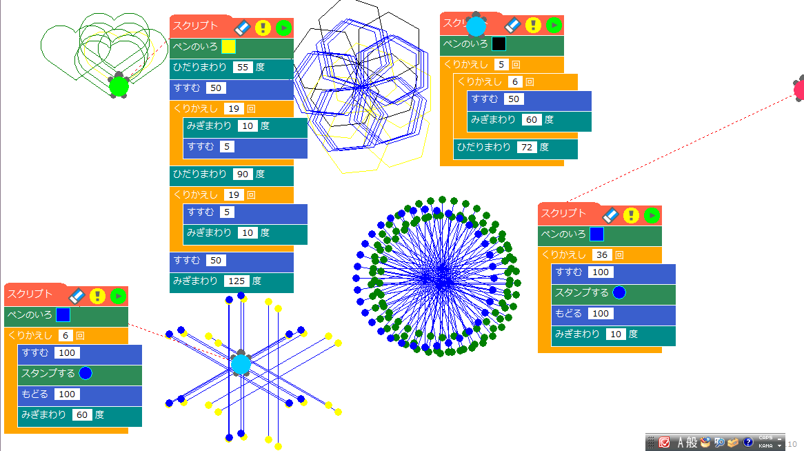 図形の法則を確認してからタートルでいろいろな図形を描くプログラムをつくりました。